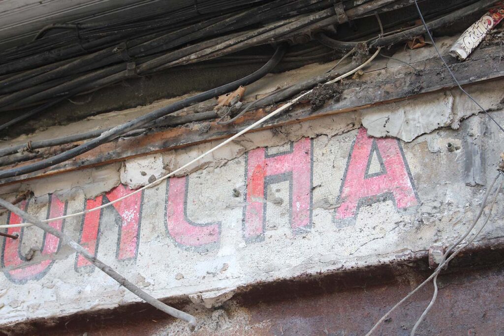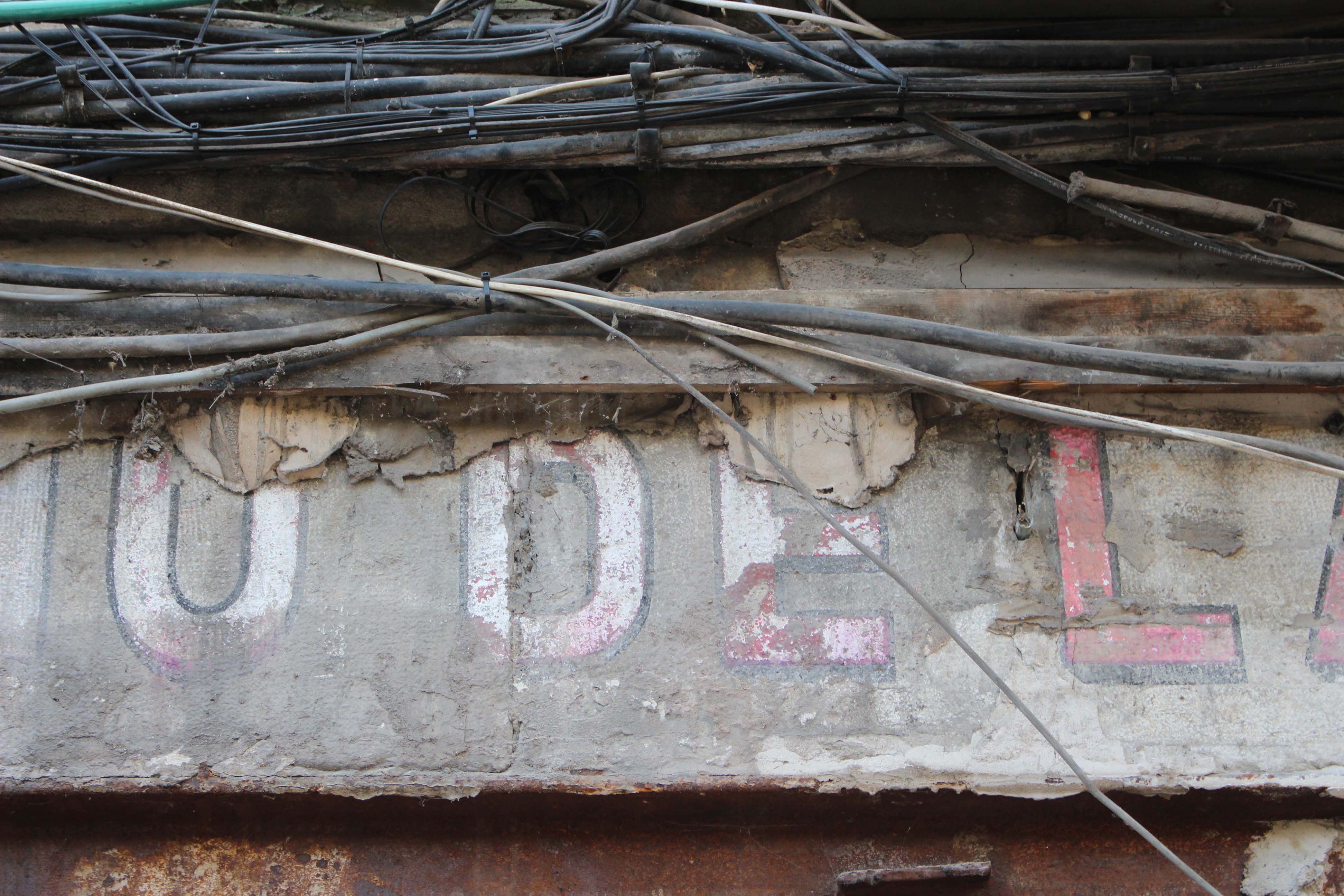 Rotulación de mediados del siglo XX (entre los años 30 y 50) hecha sobre el dintel de la misma superficie de lo que fue la tienda, realizada en una tipografía de palo seco con tono rojo y negro. Hay una parte que está bastante más deteriorada la izquierda, pero otra que vemos perfectamente la calidad del trabajo y los pigmentos originales. Su conservación, probablemente, ha podido ser porque a la hora de instalar otros rótulos posteriormente, se hicieron sobre dos listones de madera para montaje, como se ve en los restos del que es el superior, lo que pudo generar esa cámara de aire.