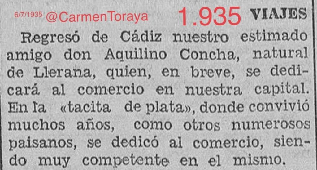 D. AQUILINO DE LA CONCHA RUIZ, un jándalo de Llerena ( Cantabria), que de chicuco emigró a Cádiz, La Tacita de Plata, donde vivió muchos años dedicándose con esfuerzo al comercio de ultramarinos ( ver recorte que aporto, publicado en la prensa santanderina de comienzos de noviembre de 1935).