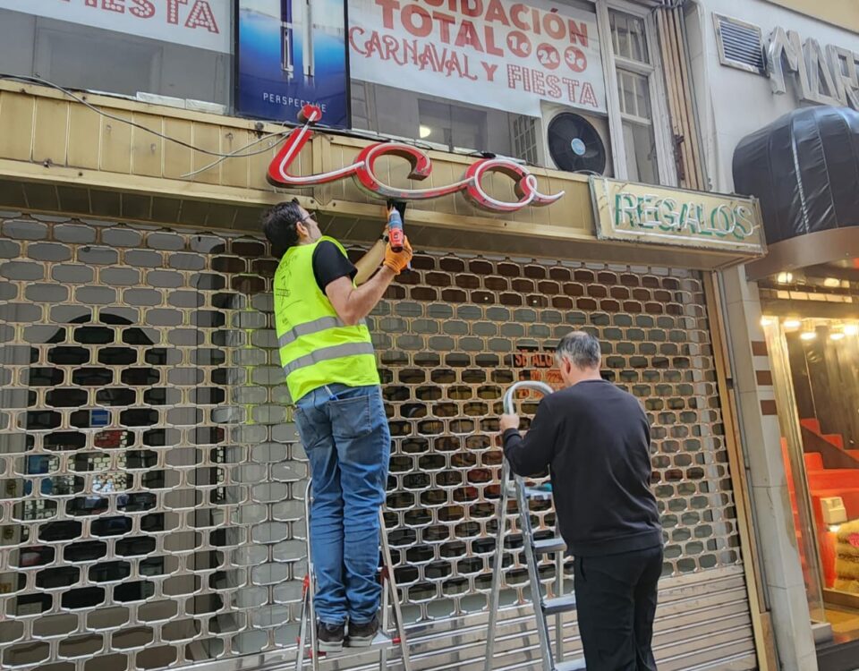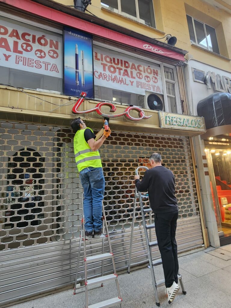 Por otro lado, también el mismo día, pudimos recoger el cartel de “Automóviles R. Jaen”, por el comienzo de las obras de reforma del local, en la calle Tetuán. El negocio de importación de vehículos tenía cerca de veinte años.